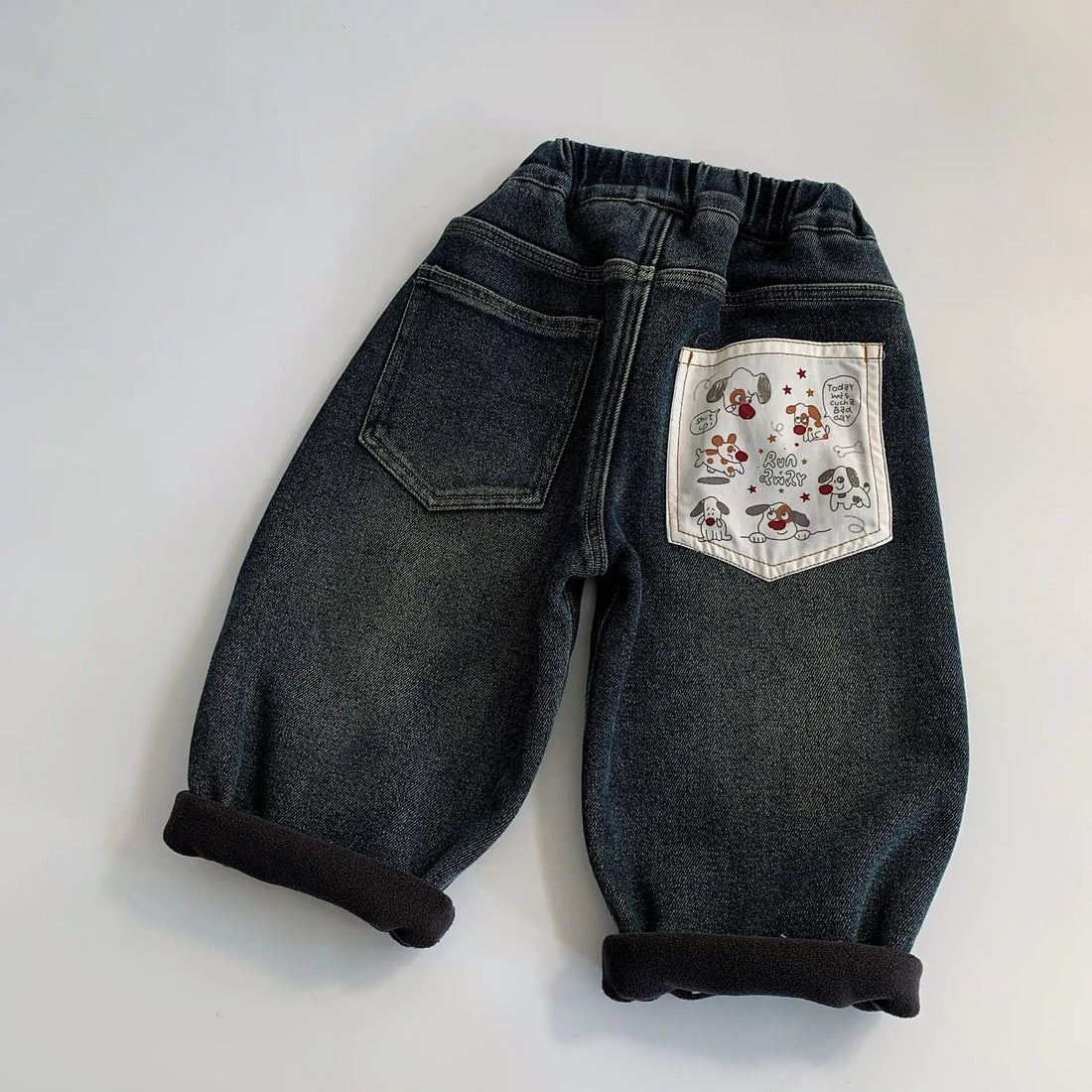 Fleece-Lined Cartoon-Pocket Denim Pants