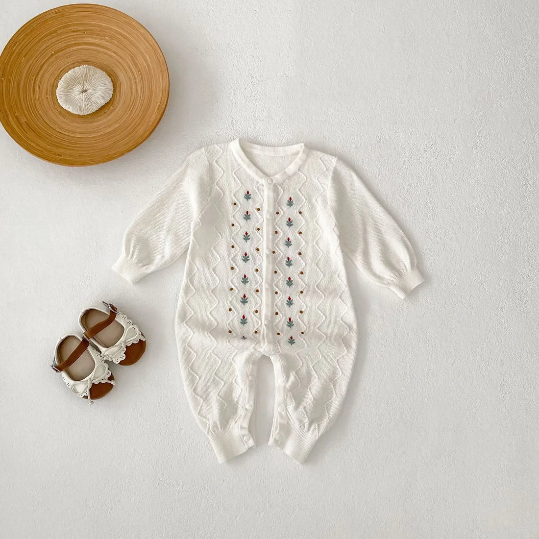 Wrap your baby girl in cozy autumn style with this Embroidered Flower Print Knit Romper...