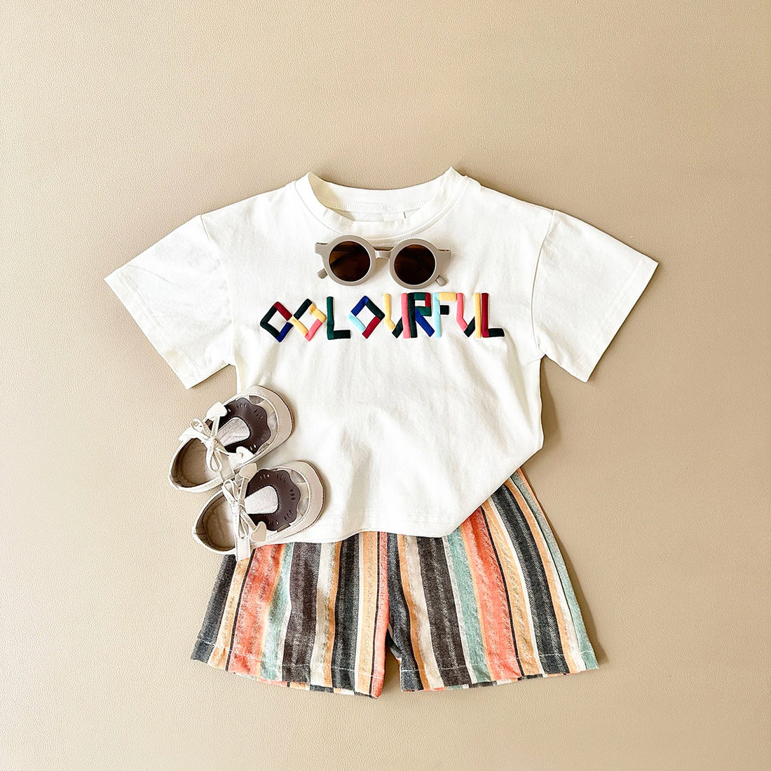 Make a splash of sunshine with this vibrant "COLORFUL" Tee & Striped Shorts Set! ๐...