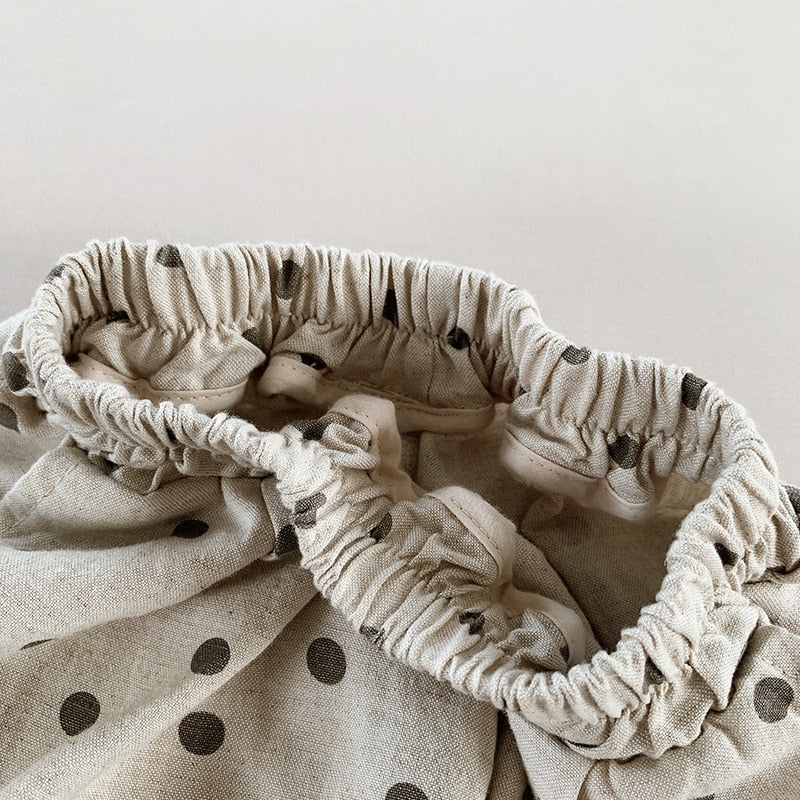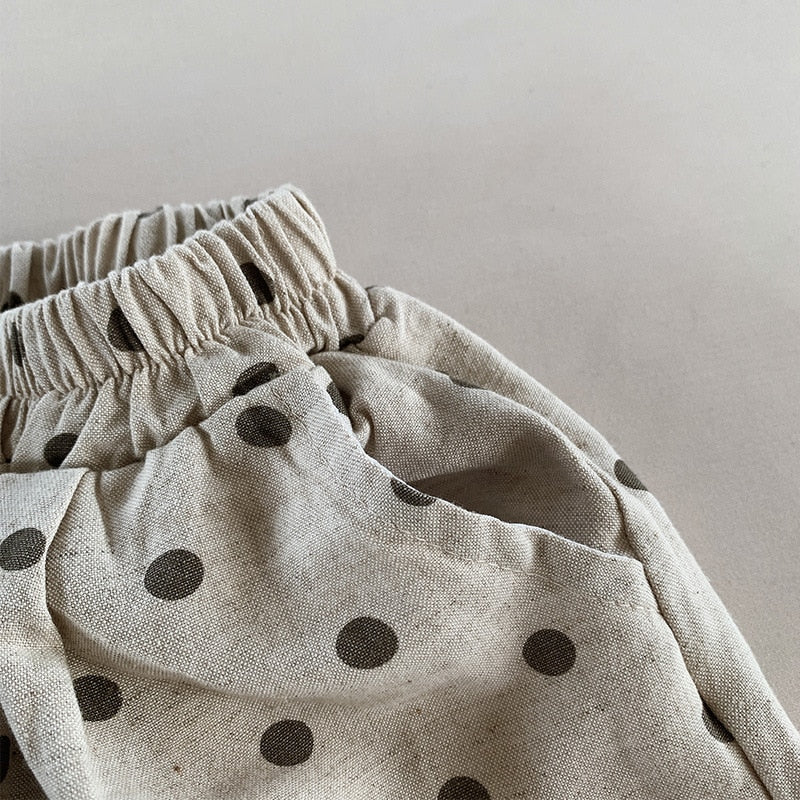 These stylish and comfortable harem pants are perfect for your child to wear in the summer. Made of a cotton and linen blend, they're soft and breathable, making them perfect for hot weather. The mid-waist design and loose fit provide a comfortable and relaxed fit, while the dot print adds a touch of personality. The elastic waist makes them easy to put on and take off, and the pockets provide a convenient place to store small items.