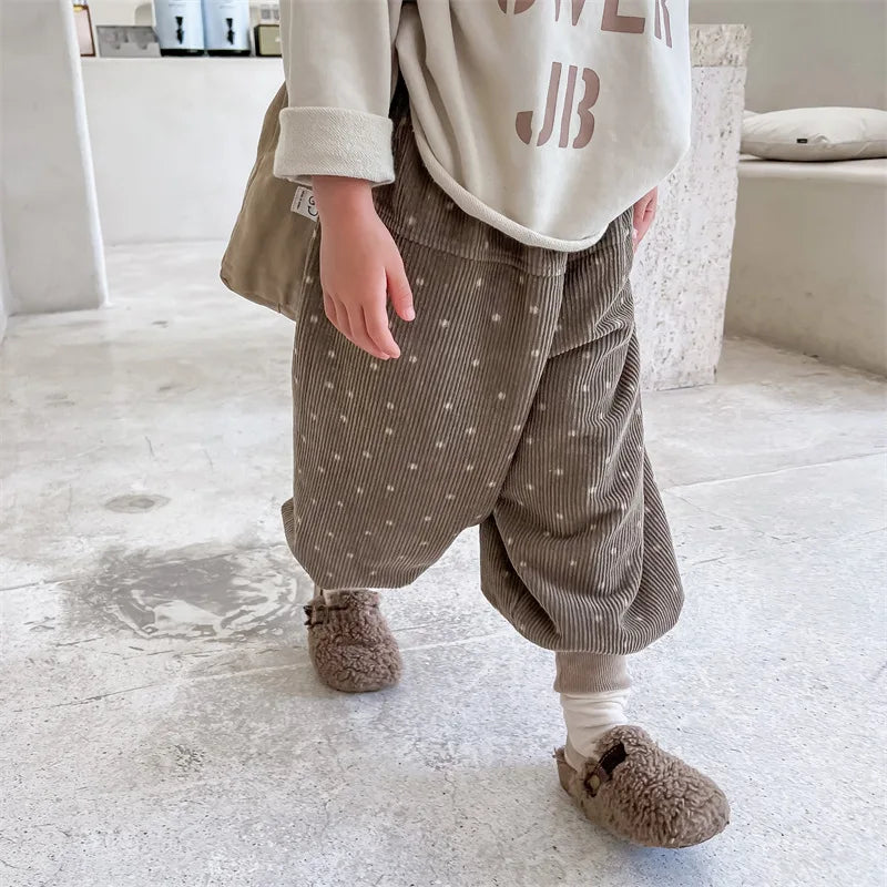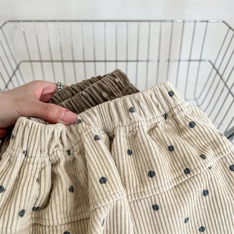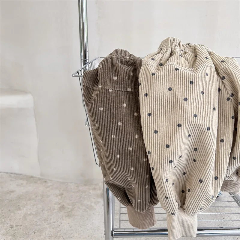 These Corduroy Polka Dots Unisex Pants are the perfect blend of style, comfort, and versatility. Crafted with soft cotton material, they offer a regular fit that ensures optimum comfort for your little ones. The playful polka-dot pattern adds a touch of fun to their wardrobe. With an elastic waist closure, these pants provide easy dressing and a secure fit. Ideal for both boys and girls aged 1-6 years, these pants are a must-have for the spring and autumn seasons. Embrace style and functionality with these trendy pants! šš