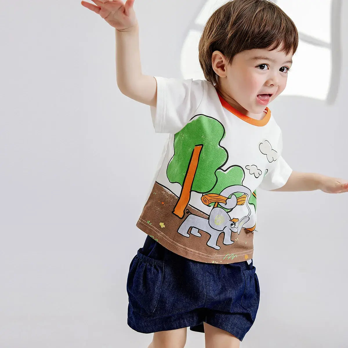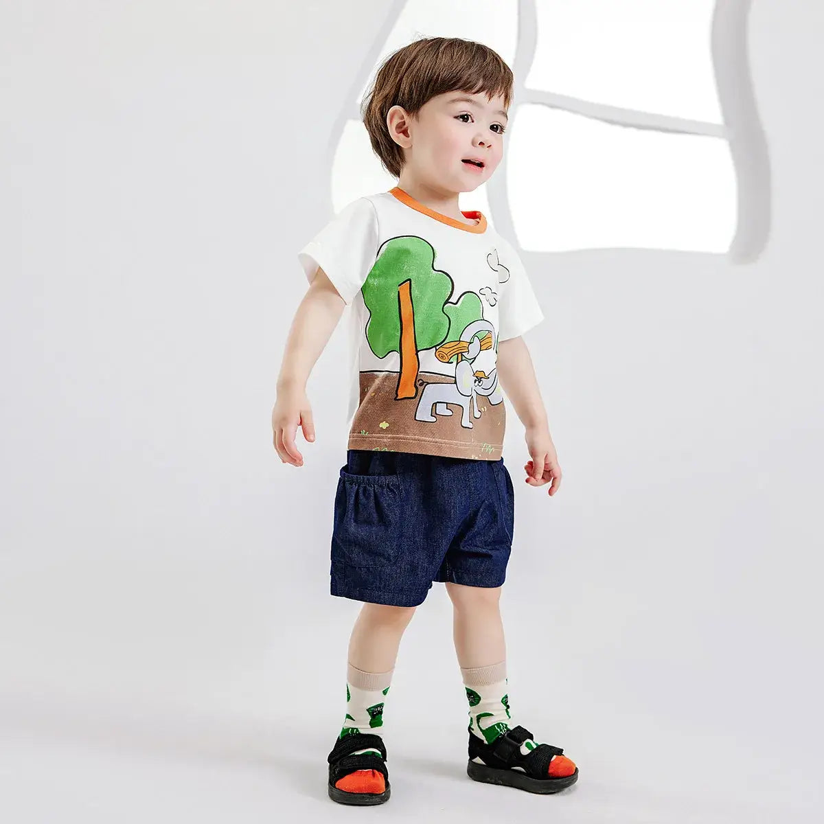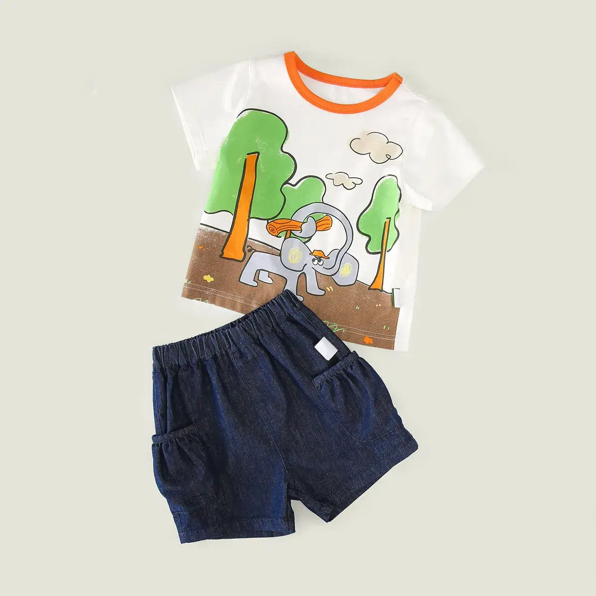Get your little explorer ready for summer adventures with our Elephant Scene Printed Tee & Denim Shorts Set! 🐘👖 Perfect for boys aged 1-6 years, this casual outfit combines the softness of a cotton jersey tee with the classic style of denim shorts. The adorable cartoon elephant print on the short-sleeved tee adds a playful touch that will capture your child's imagination. 🌞 With an easy pullover design and a comfy O-neck collar, dressing is a breeze. The set fits true to size, ensuring a perfect fit for all-day comfort. Ideal for sunny days at the park or casual family outings, this boys' clothing set is a must-have for a fun and stylish summer! 🏞️