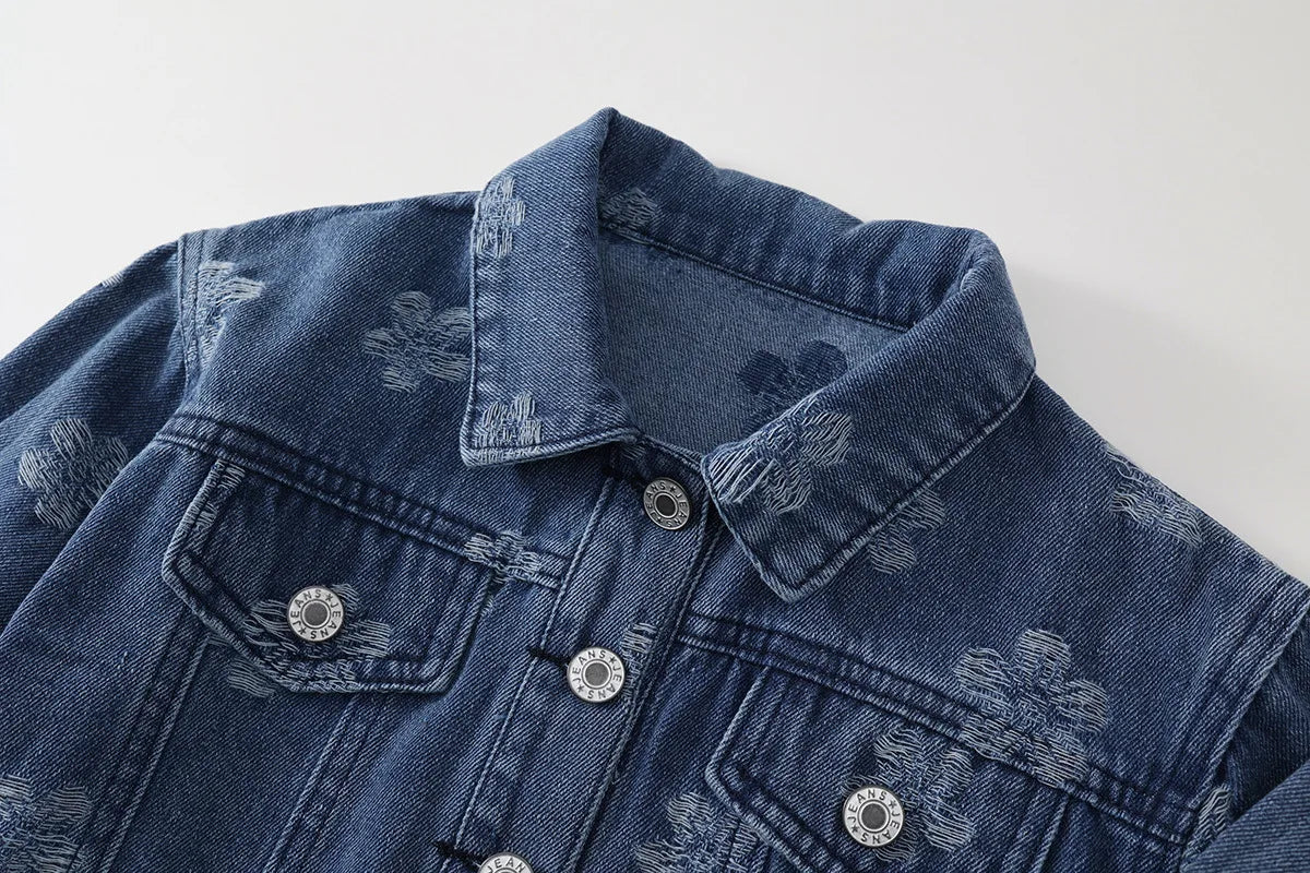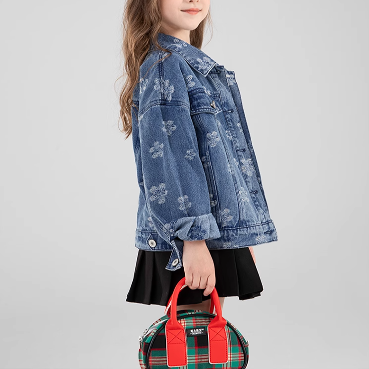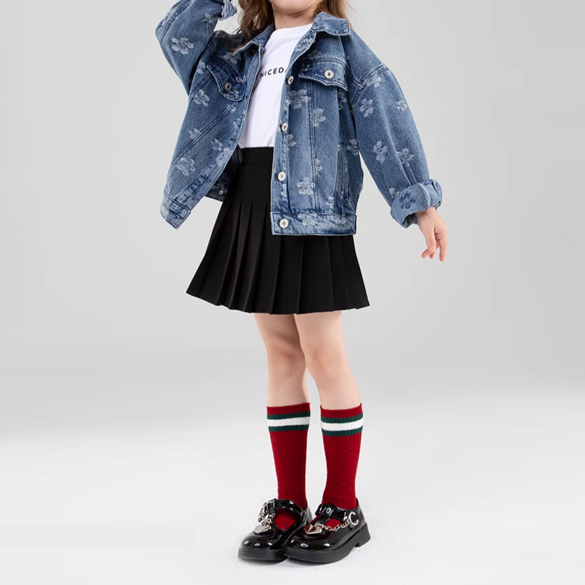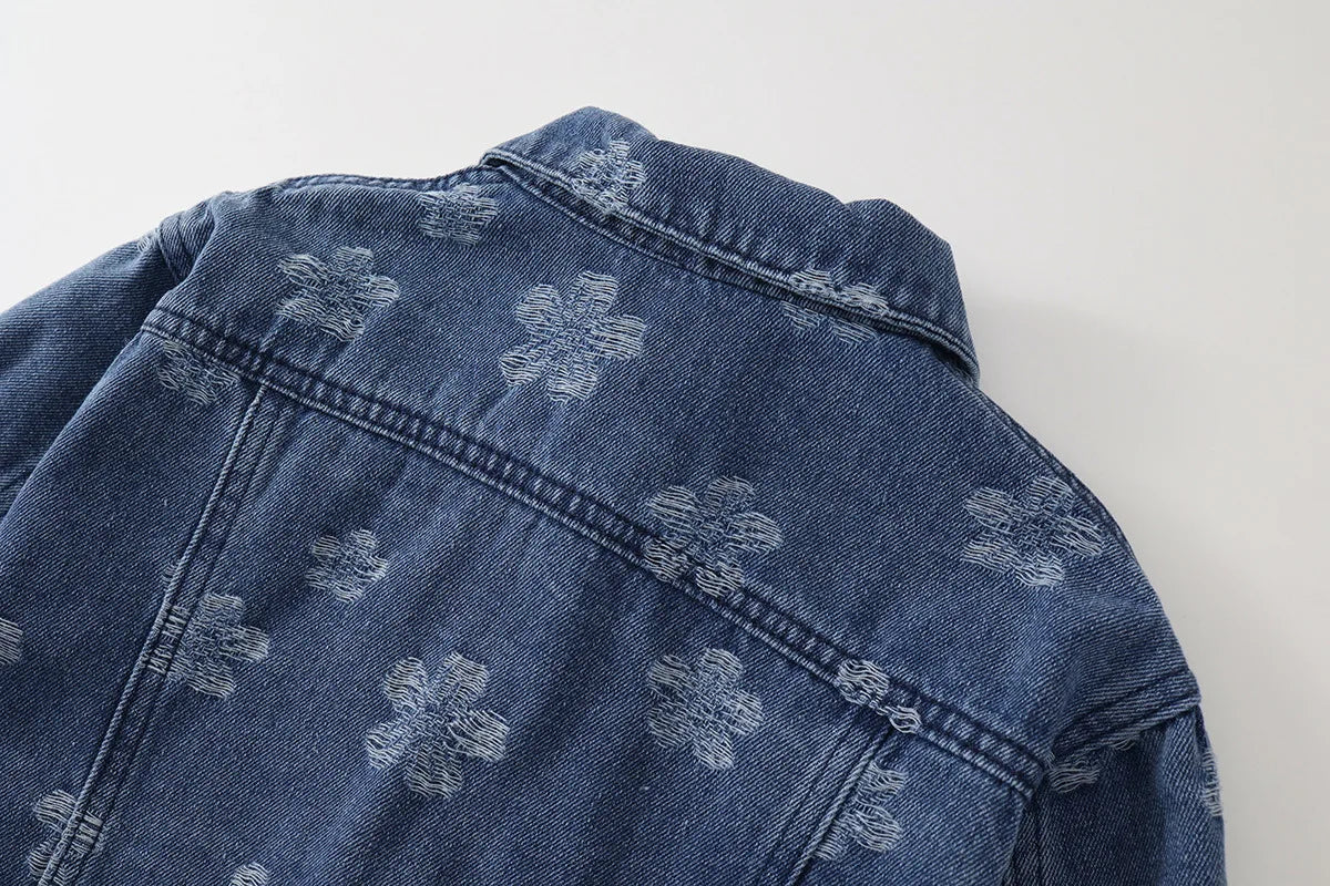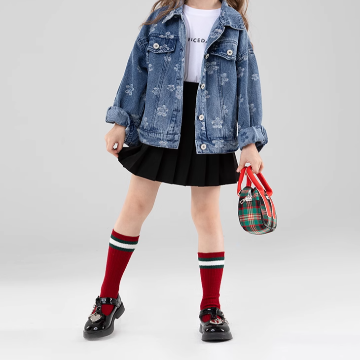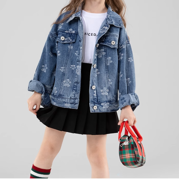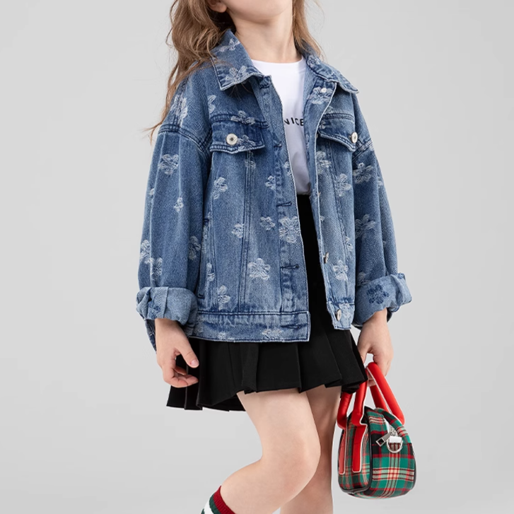 Elevate your little fashionista's wardrobe with our Floral Denim Jacket! 🍂✨ This stylish jacket features a vibrant floral pattern that brings a touch of charm to the classic denim look. Crafted from durable worsted fabric, it provides cozy warmth for cool autumn days. The crew neck and long sleeves ensure a snug fit, while the heavy thickness makes it ideal for layering over her favorite outfits. Perfect for girls aged 1-8 years, this jacket fits true to size and is perfect for casual outings, family gatherings, or everyday adventures. 🌟💖