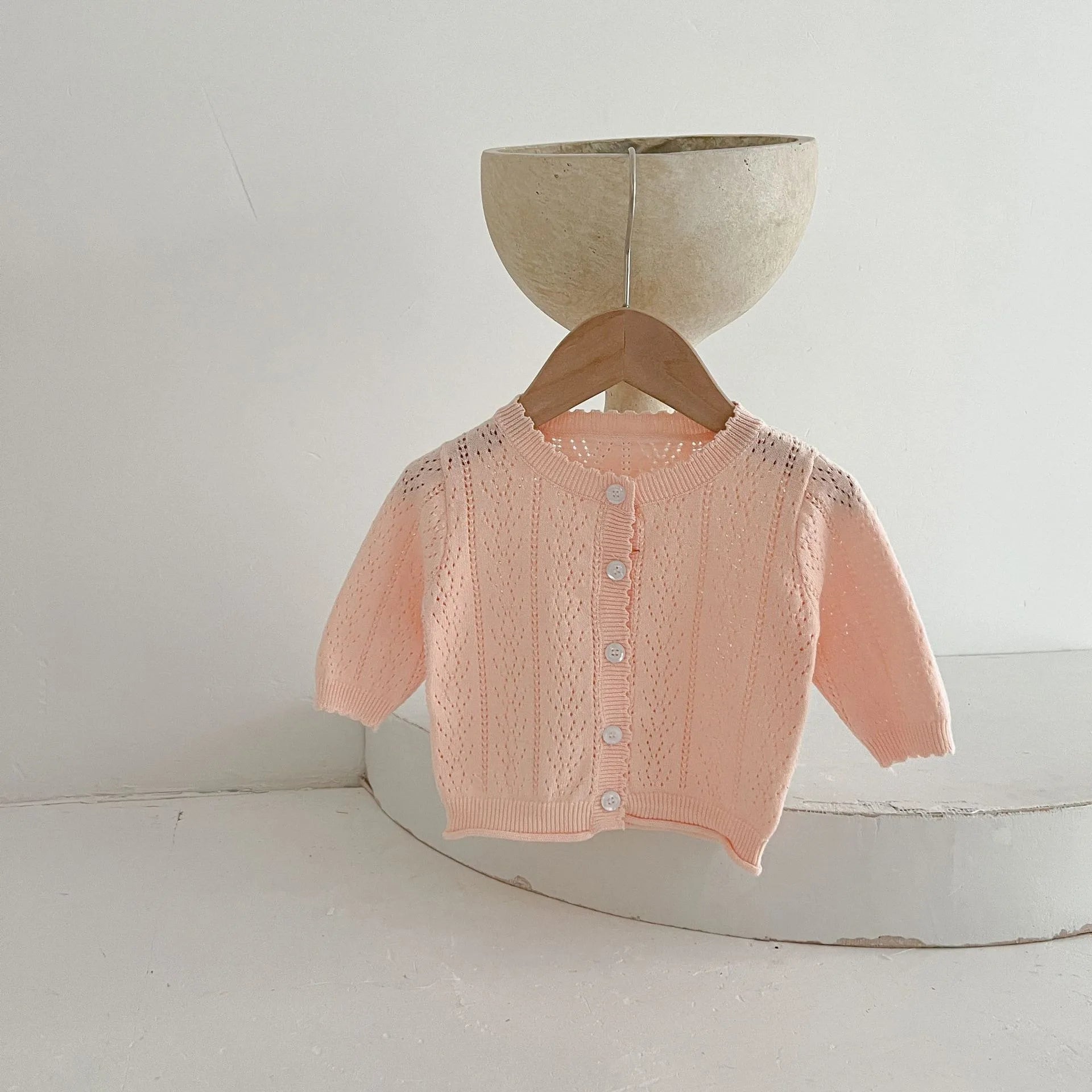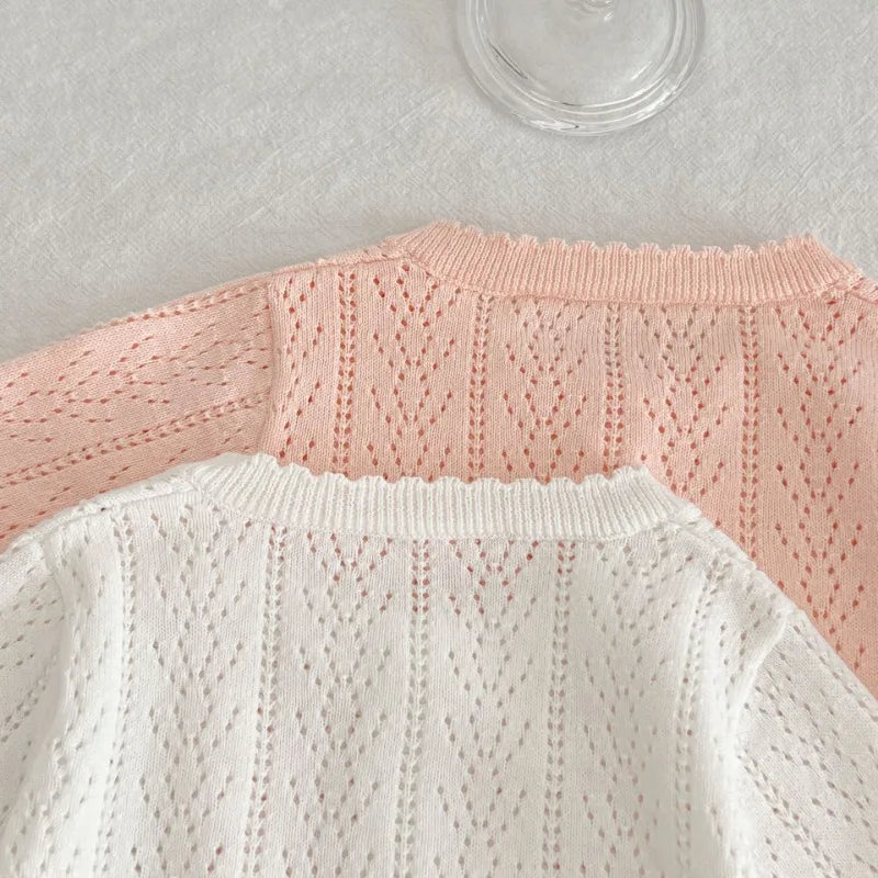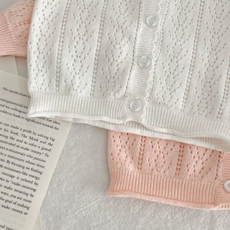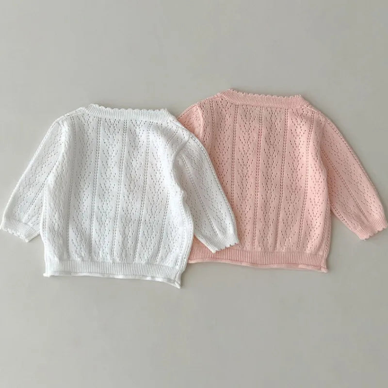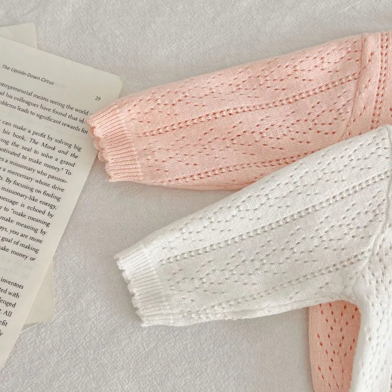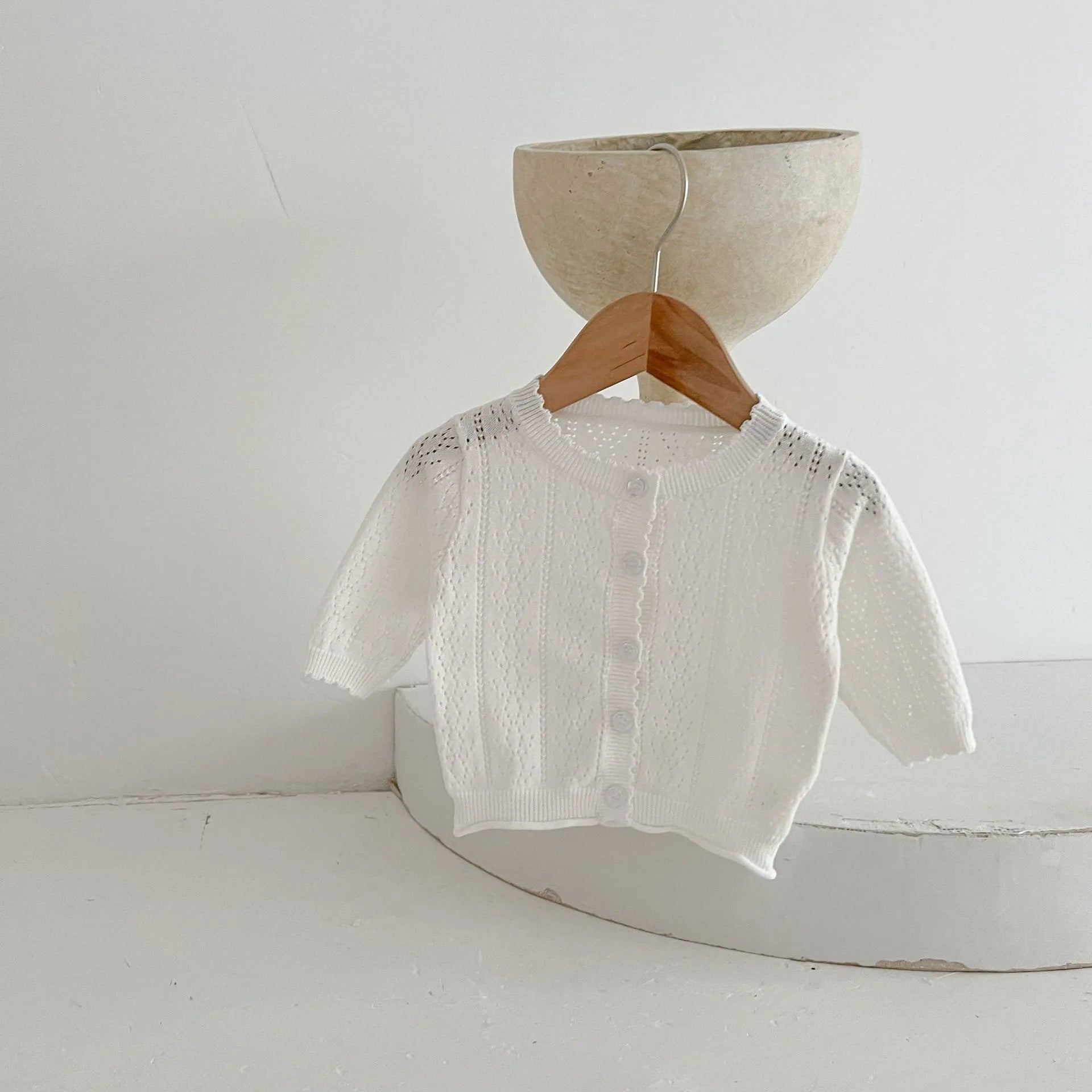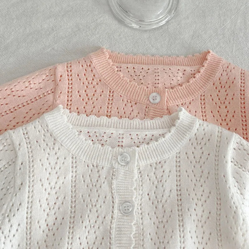Add a touch of sweet elegance to your little one's summer style with this adorable hollow-out cardigan! Perfect for girls aged 6 to 36 months, this lightweight, cotton cardigan is breathable and comfy, making it ideal for those warm, breezy days ☀️. With delicate appliques and a classic O-neck design, it features a button closure that’s easy to layer over any outfit quickly. This versatile, solid-color piece adds a charming finish to any look, keeping your little fashionista cozy and stylish all season long! 🌸✨