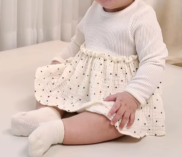 Twirl into springtime sweetness with our Girls Polka Dot Dress Onesie! 🎀 This darling piece brings vintage charm to little wardrobes during playful spring days. Crafted from soft cotton that feels like a gentle hug, this adorable onesie features a delightful polka dot pattern that adds a touch of retro whimsy to every wiggle and crawl! The comfortable O-neck and long sleeves provide perfect coverage, while the true-to-size fit ensures your little lady stays cozy during all her springtime adventures. Whether she's taking first steps or enjoying garden picnics, this onesie adds a sprinkle of spotted magic to every precious moment! 🦋