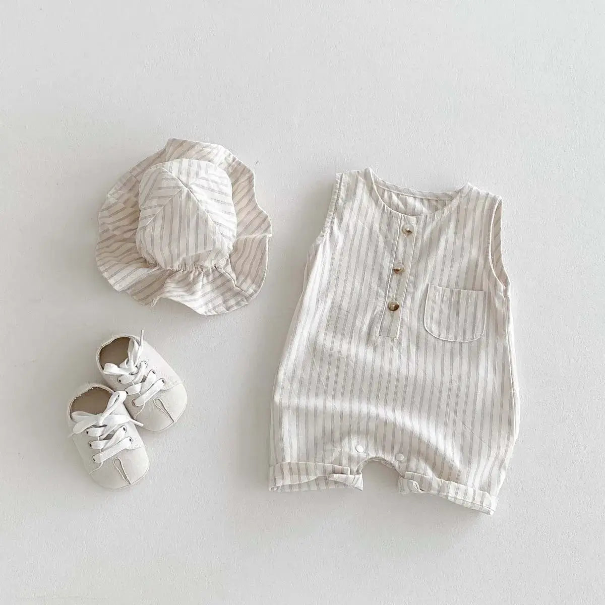 ☀️ Your little ray of sunshine will be ready for fun in the sun with this adorable Girls Striped Sleeveless Romper & Cap Set! 🏖️ Made from soft, breathable cotton, this stylish set features a classic striped pattern and a matching cap to keep your little one cool and protected. The sleeveless design and pullover closure make it easy for quick changes, so your baby can focus on playtime! 👶 #babyfashion #summerstyle #stripedromper