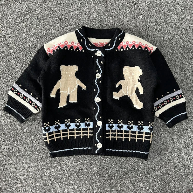 Embrace cozy cuteness with our Knitted Bear Button-Down Cardigan! 🐻❤️ Crafted from a blend of cotton and acrylic, this casual cardigan is perfect for your little ones aged 9 months to 4 years. The single-breasted closure and O-neck collar ensure a comfortable fit, while the adorable bear pattern adds a touch of whimsy. With long sleeves and a regular fit, it's ideal for the spring and autumn seasons. Dress your child in style and warmth with this charming button-down cardigan! 🌸🍂