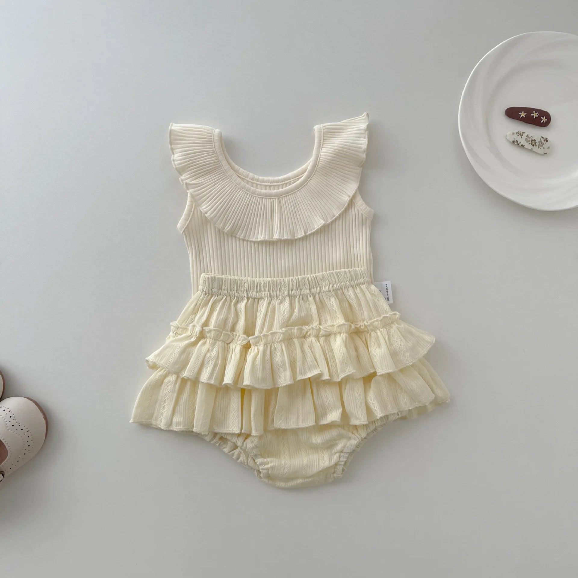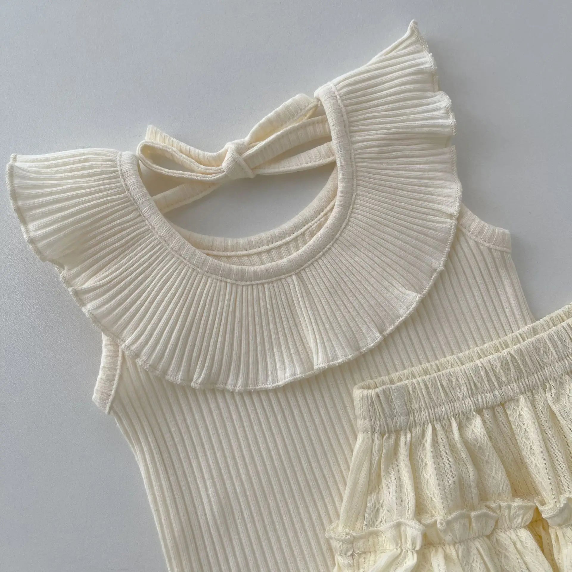Introducing our Lotus Collar Top & Princess Shorts Set, a delightful ensemble perfect for your little princess. Crafted from soft and breathable combed cotton, this casual set ensures comfort during the summer season. The sleeveless design and regular sleeve style allow for easy movement, while the O-neck collar adds a touch of elegance. The solid pattern enhances its versatility, making it suitable for any occasion. Available in sizes 6–24 months, this set is designed specifically for baby girls. Dress her in style with our Lotus Collar Top & Princess Shorts Set. 🌸👑