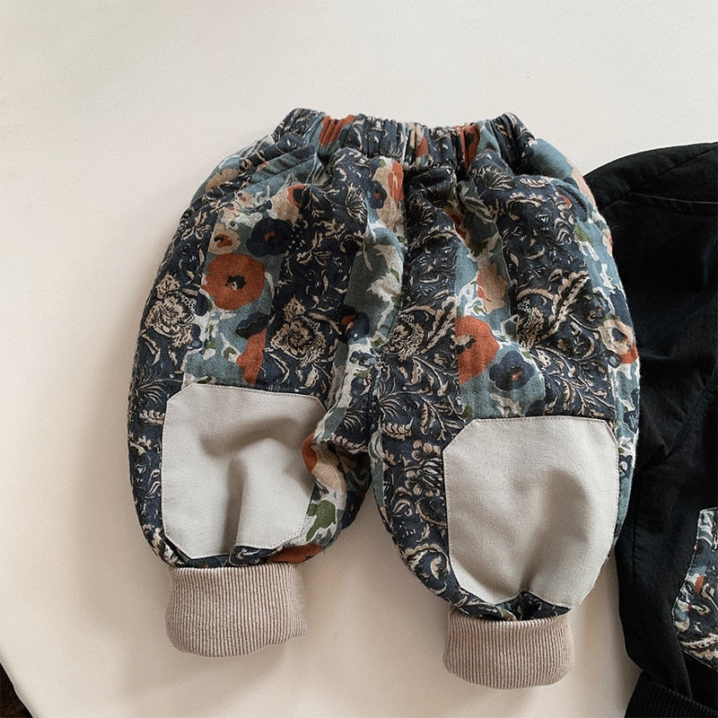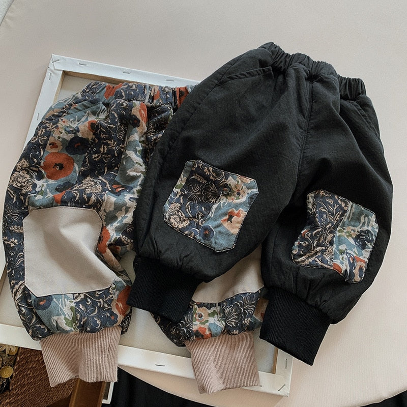Get their winter lounge look on point with our playful printed harem pants! Crafted from soft stretchy cotton, these easygoing pants feature a fun allover print that pops. An elastic mid-waist and tapered ankles create a laidback silhouette. With handy side pockets and a super comfy loose fit, they’re perfect for playground time, sleepovers, or just chilling at home. The vibrant print options add spirit to their winter relaxation wear. Designed for girls and boys who march to the beat of their own drum. Mix and match the patterns for a look that’s uniquely them! Model Children printed harem pants, another original lounge must-have from Komfy Kloset!
