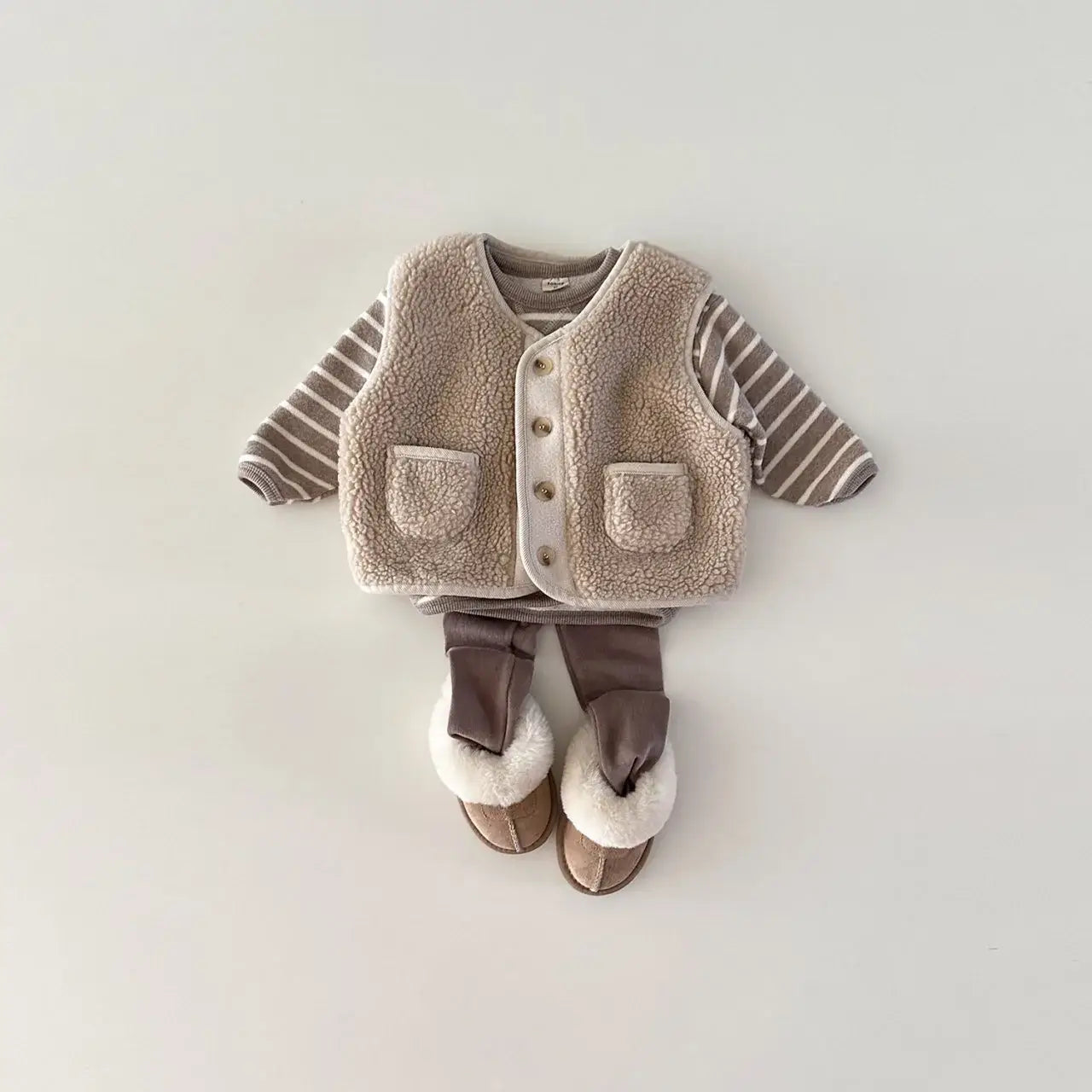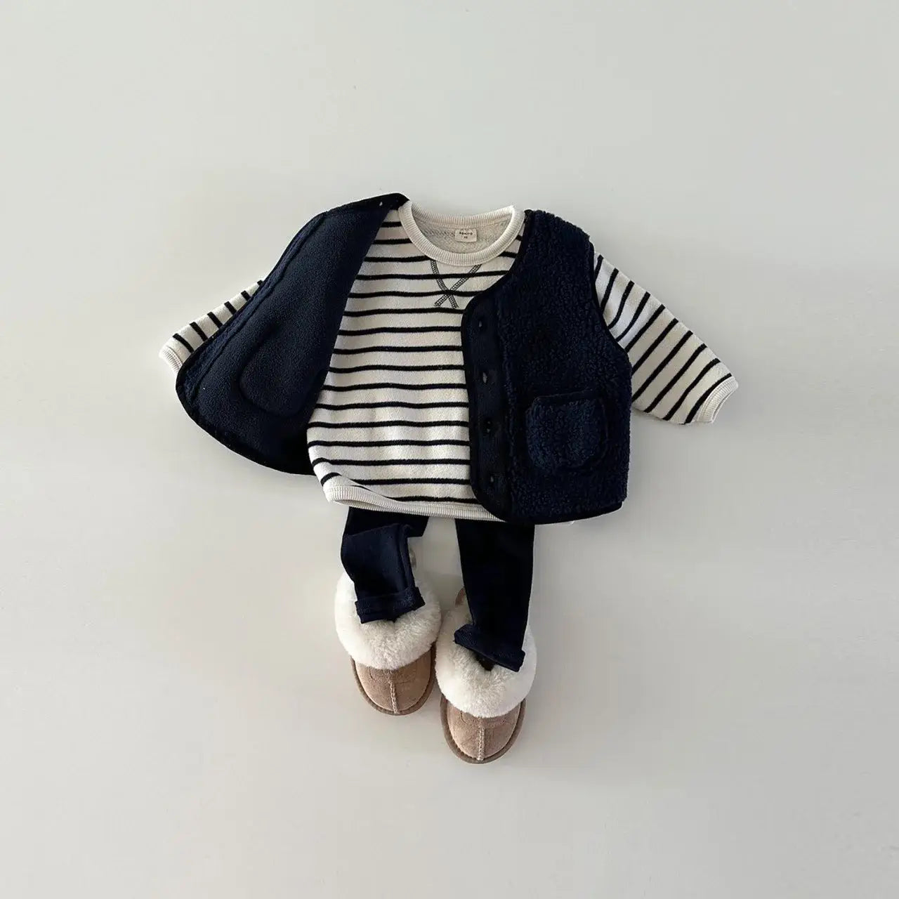 Get cozy this winter with our Sherpa Vest + Striped Top + Leggings Set! 🧥🌟 Crafted from soft cotton, this casual set includes a warm vest, stylish striped top, and comfy leggings. Perfect for little ones aged 9 months to 4 years, this unisex set is designed for maximum comfort and style. The long sleeves and o-neck collar provide extra warmth, while the single-breasted closure adds a trendy touch. Whether they're playing or lounging, your little one will look adorable in this must-have winter ensemble. ❄️✨