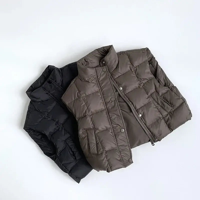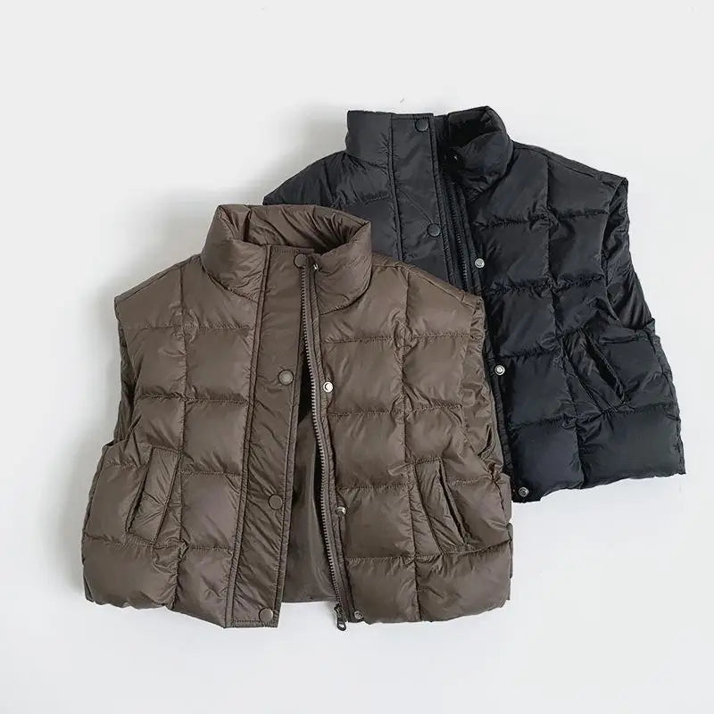 Layer up for winter adventures with our Sleeveless Puffer Zip-Down Vest! ❄️🧥 Designed for boys and girls aged 1-6, this thick, padded vest is made from a durable blend of cotton and polyester to provide cozy insulation on chilly days. The solid color and casual style make it a versatile layering piece for any outfit, while the zip-down closure and turtleneck collar add extra warmth and comfort. Perfect for outdoor play, family outings, or everyday wear, this unisex vest is a winter wardrobe essential that fits true to size for all-day coziness! 🌟🍁