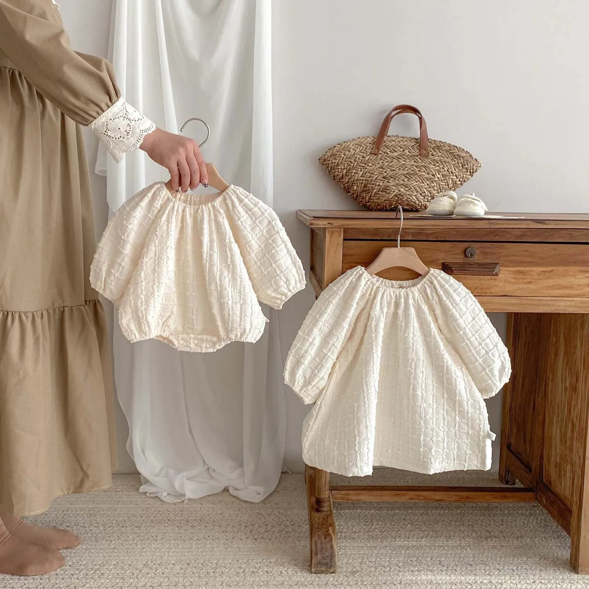 Get your little girl ready for any occasion with our Solid Ivory A-Line Dress & Onesie. Made from soft and breathable cotton, this dress is designed to keep her comfortable in both spring and autumn. The O-neck collar and long sleeves add a touch of elegance, while the pullover closure makes dressing a breeze. With its solid pattern and flattering A-line silhouette, this dress is perfect for your stylish little girl. Available in sizes for ages 6-36 months, it fits true to size. Get this adorable dress today and let her shine! ✨👧🌸 #BabyFashion #StylishKids