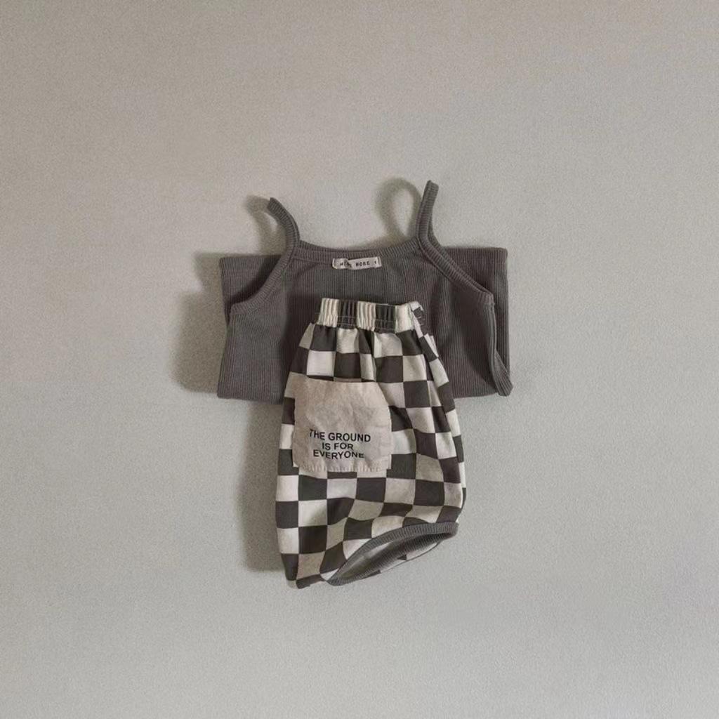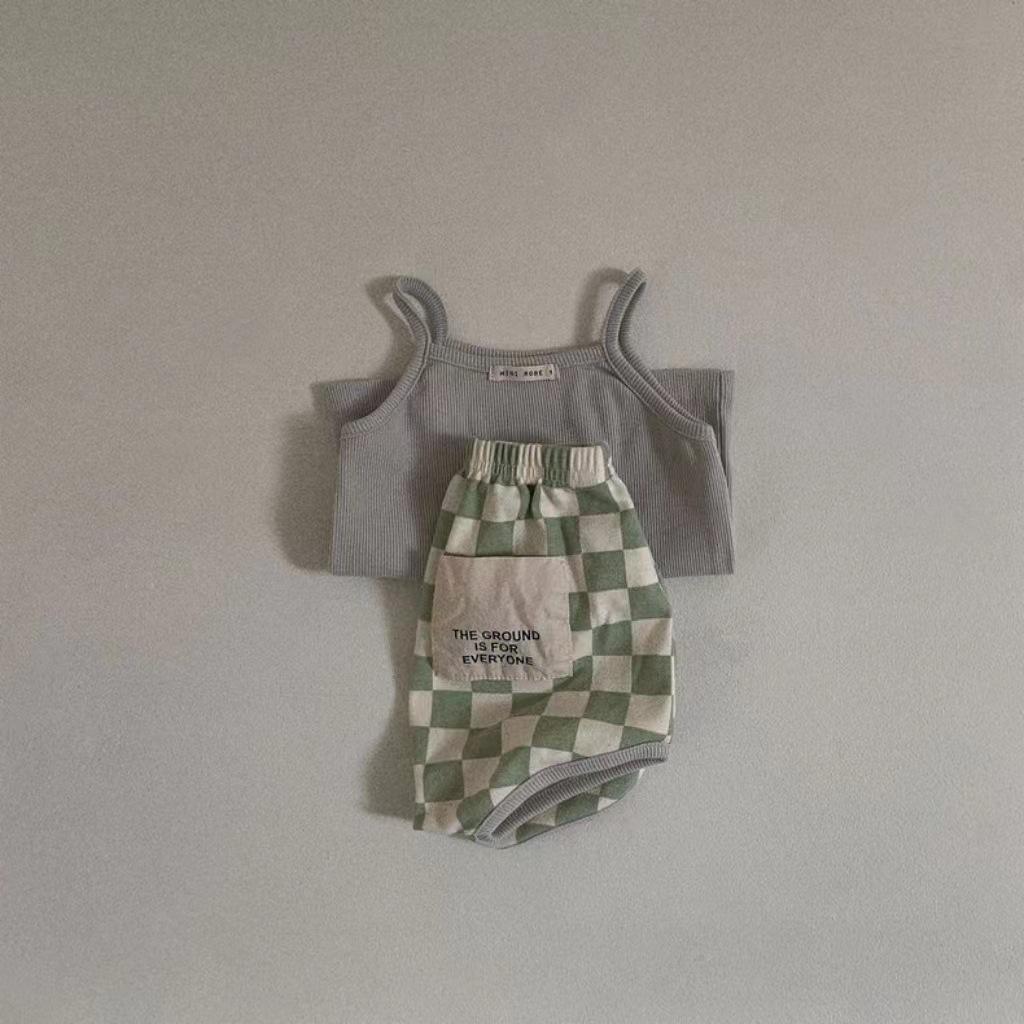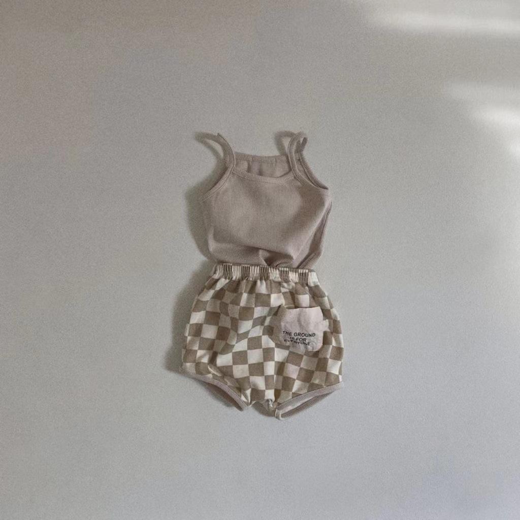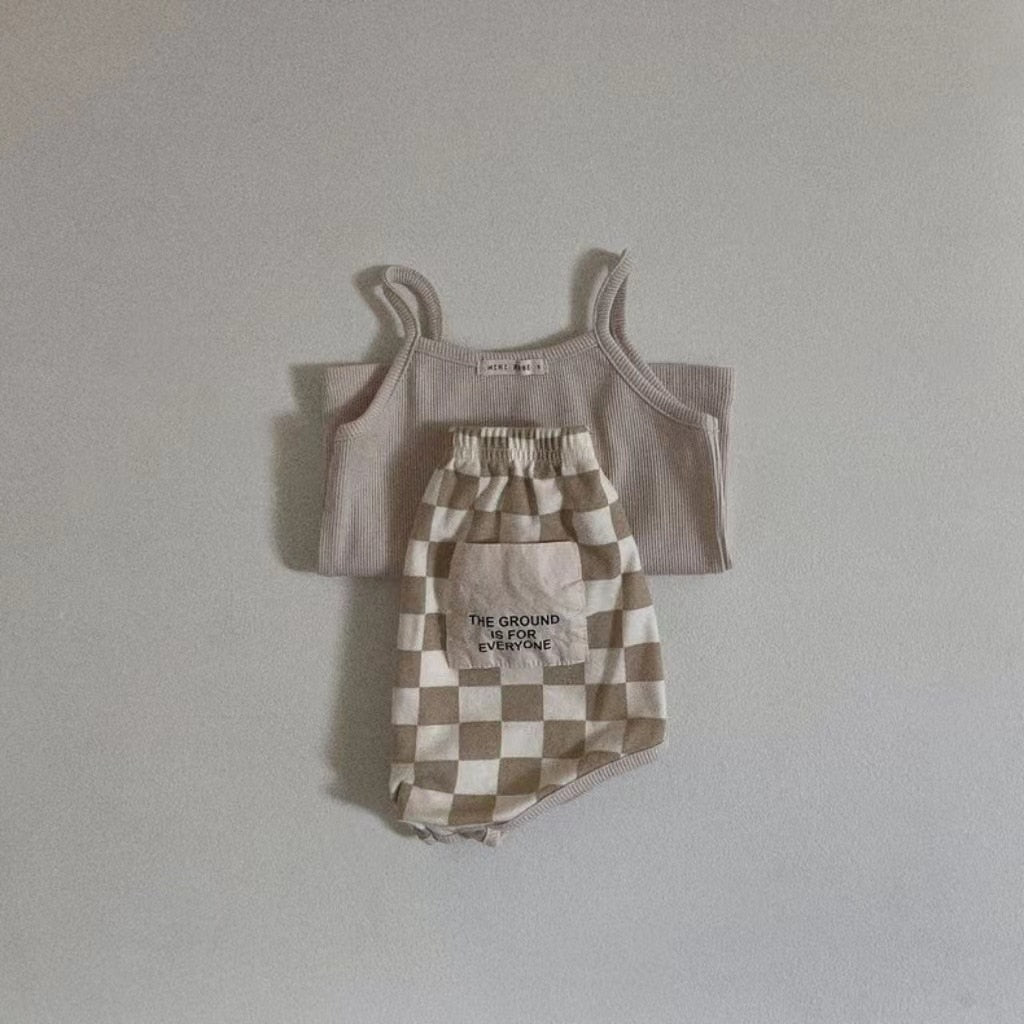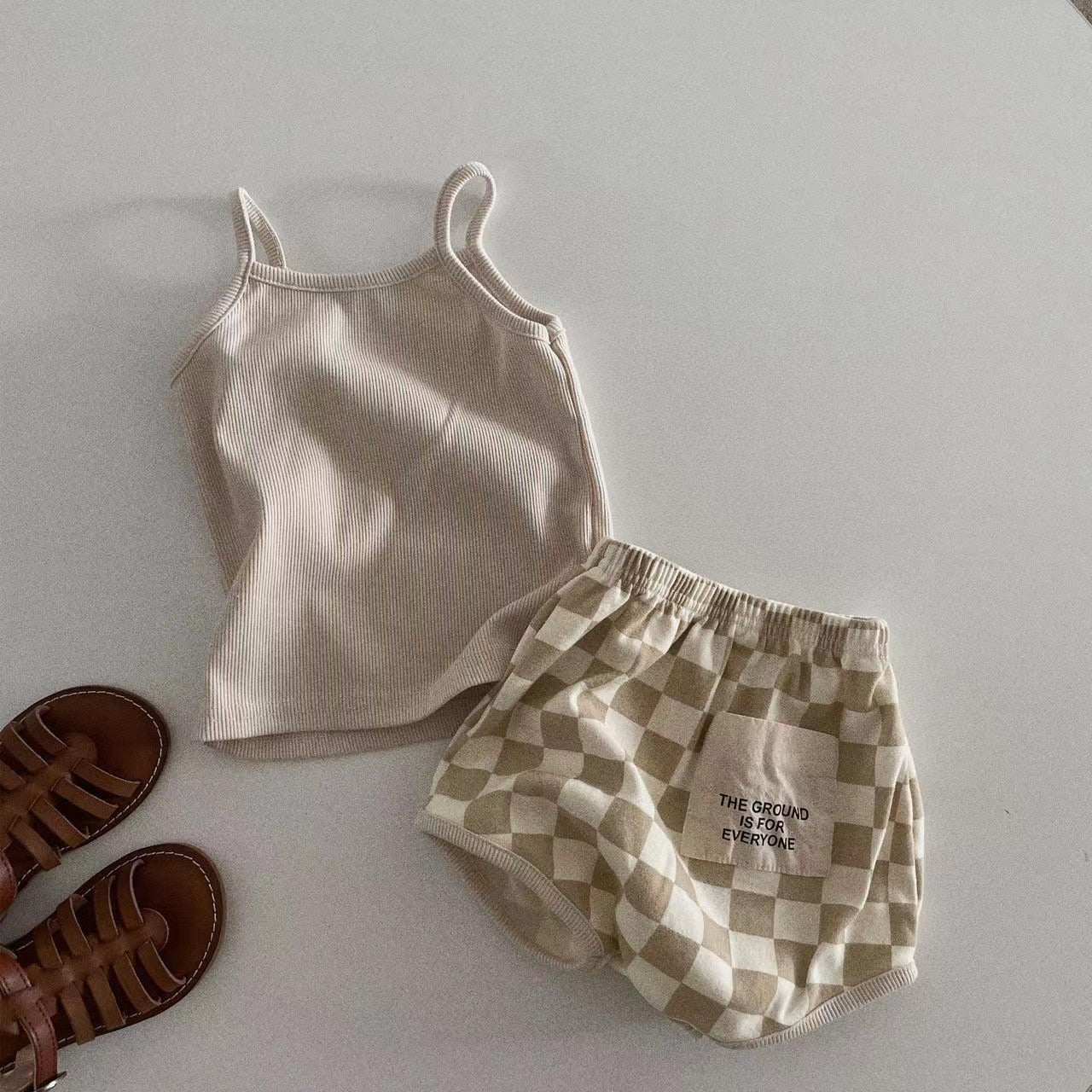 Solid Vest & Patch Plaid Shorts Set