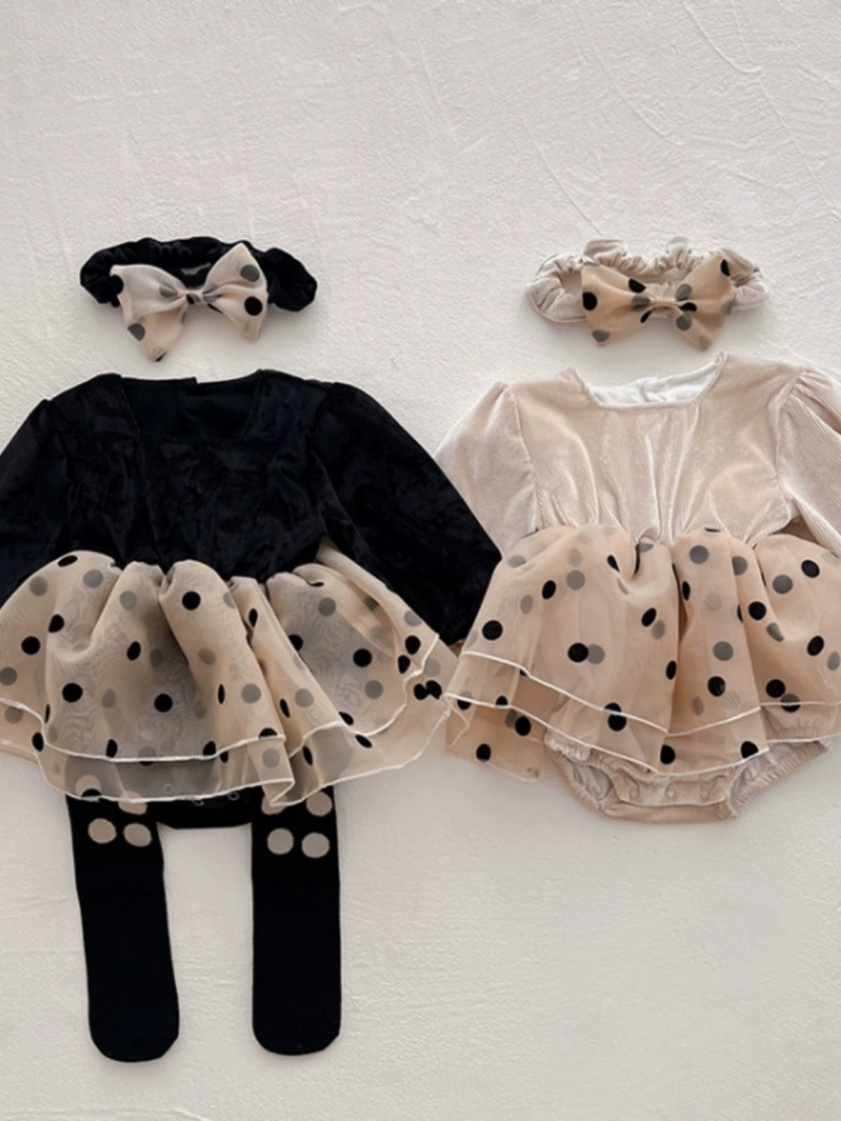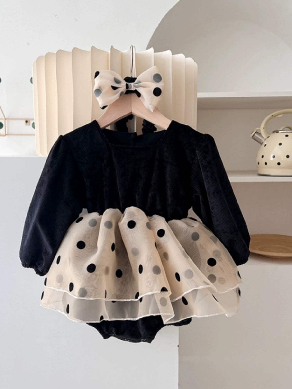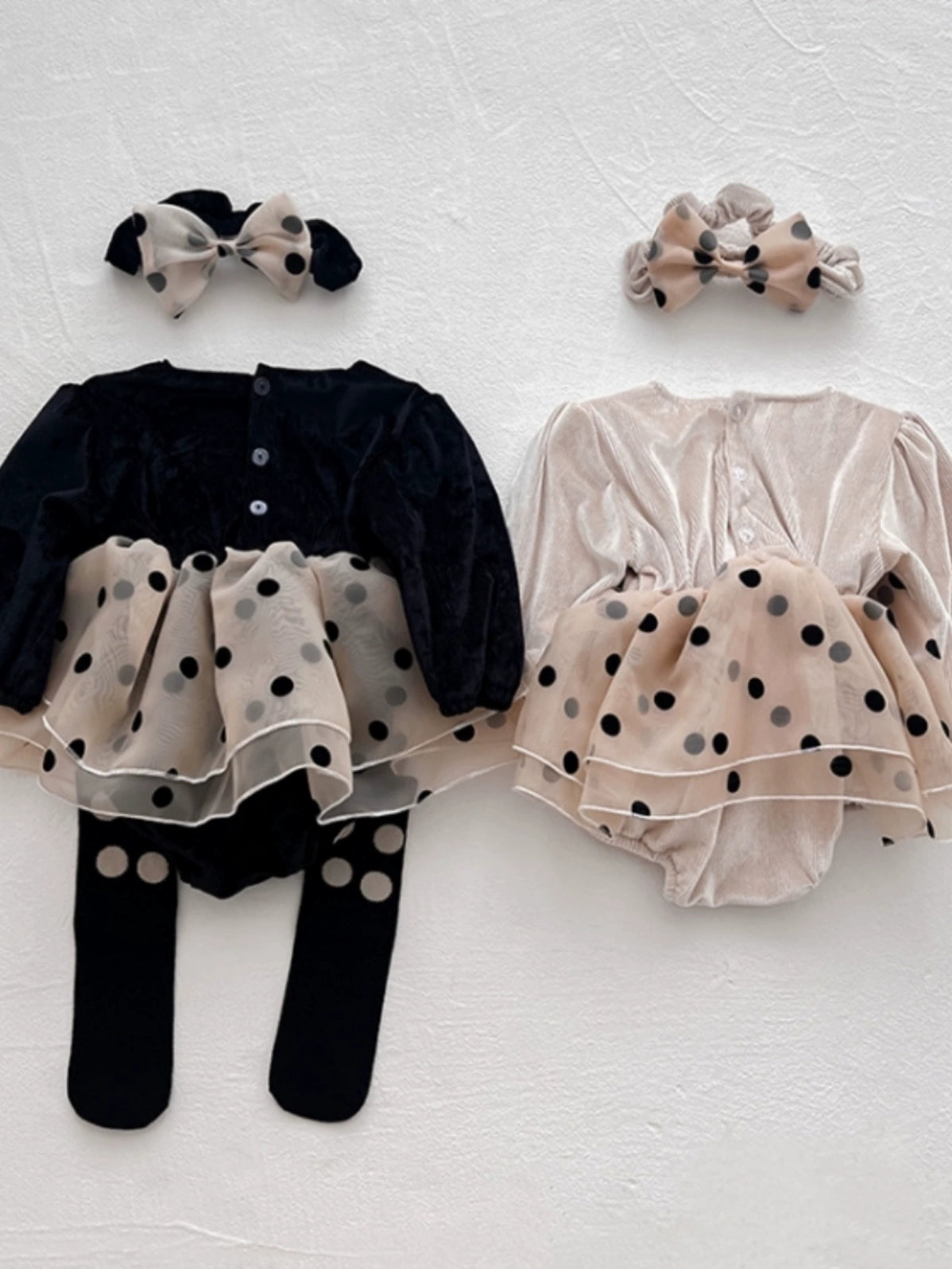 Your little princess deserves a royal wardrobe! 👶✨ The Spring Princess Polka Dot Velvet Mesh Jumpsuit blends elegance with comfort, making it a standout piece for all occasions. Featuring soft velvet fabric with a delicate polka dot pattern and a dreamy mesh overlay, this long-sleeve jumpsuit brings out the magic in every moment. 🌟 Available in classic black and soft apricot, it’s designed for newborns and is suitable for all seasons.