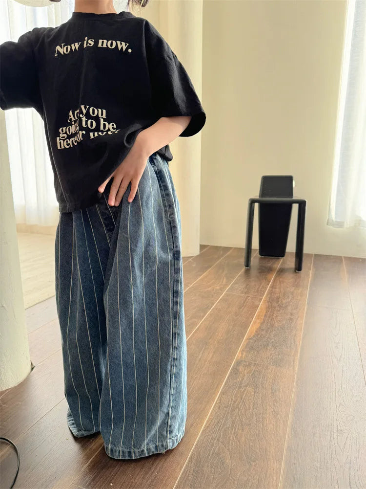 Let your little adventurer loose in comfy style with our Striped Wide Leg Denim Pants! 👖 These unisex jeans are made from breathable cotton and feature a loose fit that's perfect for all-day play. 🤸♀️ Whether they're climbing at the playground or exploring the park, the elastic waist ensures a stay-put fit, while handy pockets keep treasures safe. 🍂 Available in a range of sizes for toddlers and young children, these spring and autumn essential striped pants are a must-have for any wardrobe! ✨