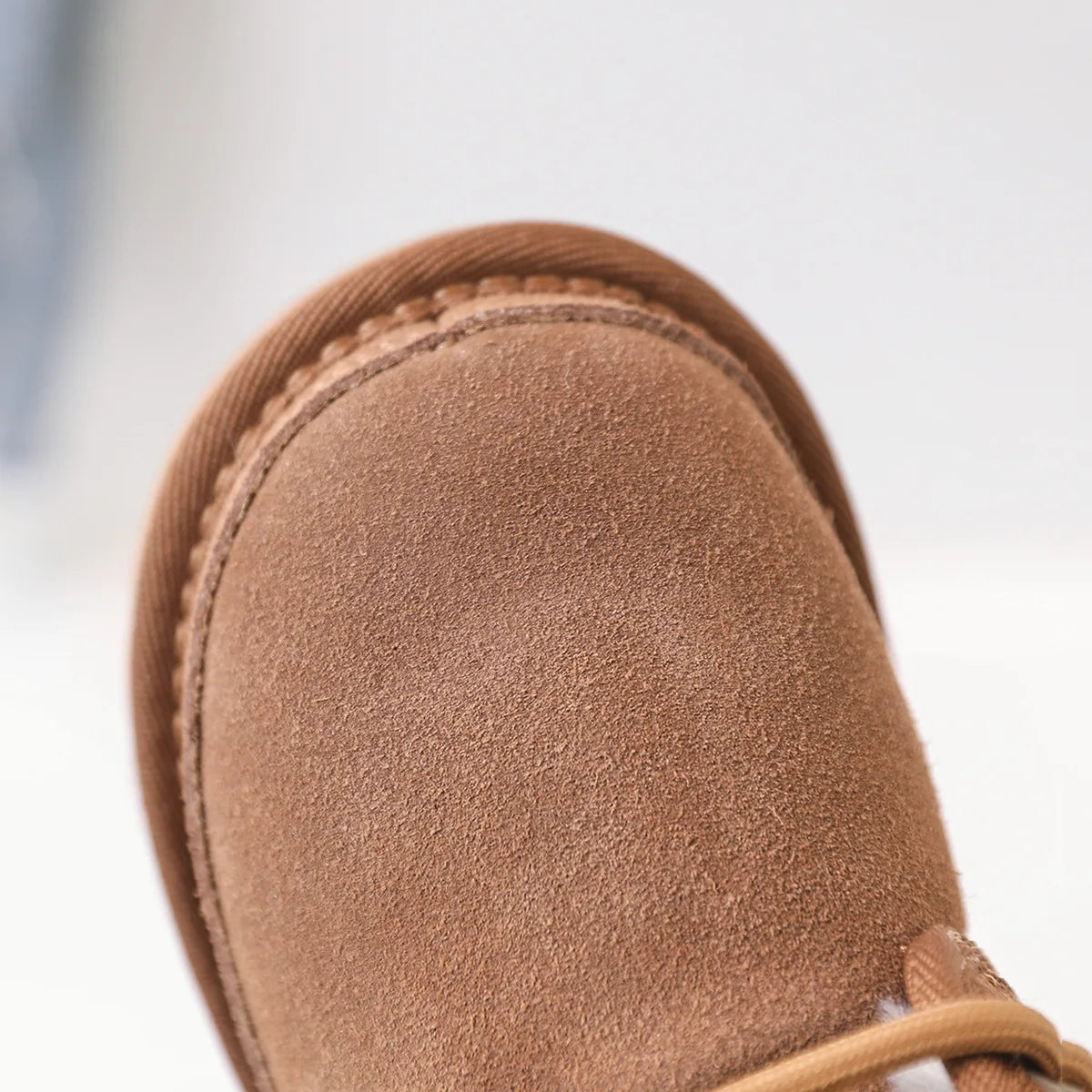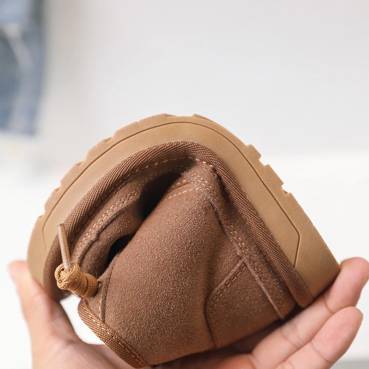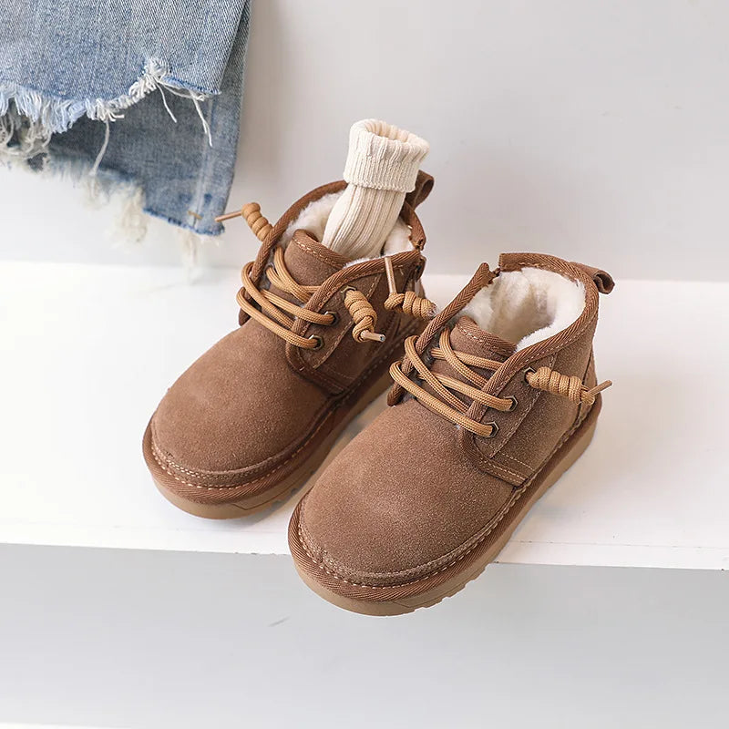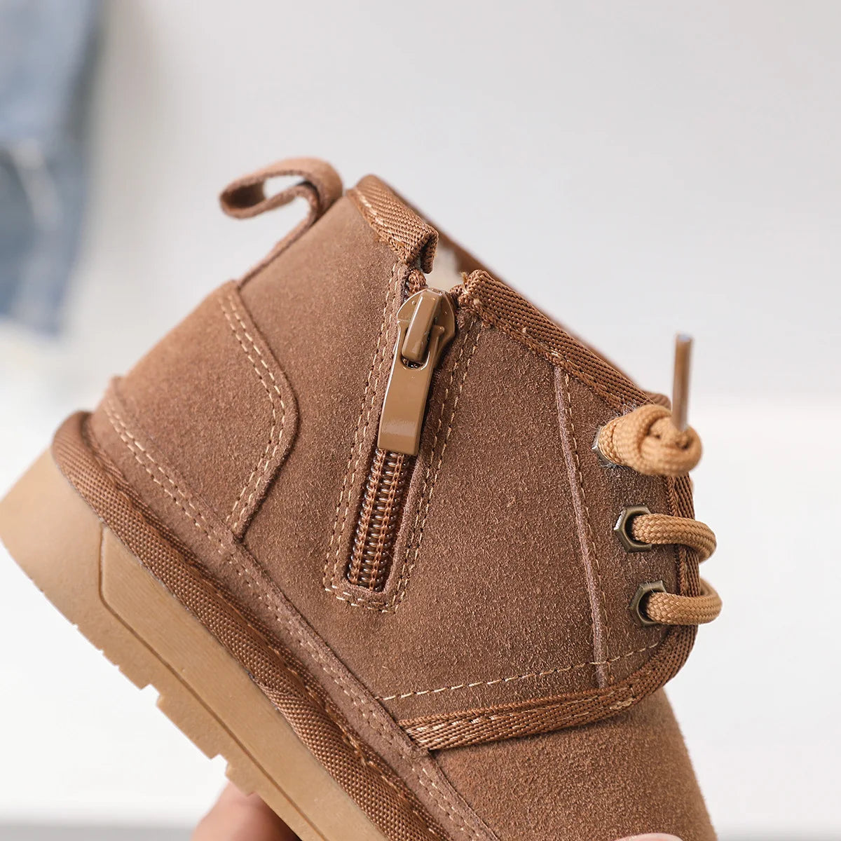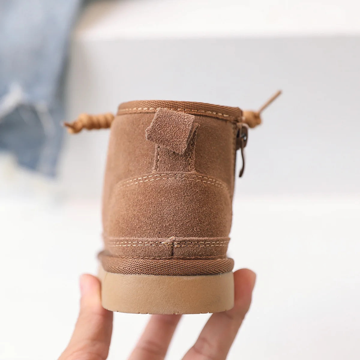Keep little feet cozy and stylish in our Thick Plush Suede Winter Boots! ❄️🧸 Designed with genuine leather and plush lining, these boots are perfect for chilly days, providing warmth and comfort with every step. The anti-slip rubber outsole ensures a secure grip, while the waterproof design keeps feet dry during snowy adventures. Featuring a convenient zip closure for easy wear, these boots fit true to size and are ideal for both boys and girls. Durable and fashionable, they're the perfect addition to your child's winter wardrobe! ☃️🥿