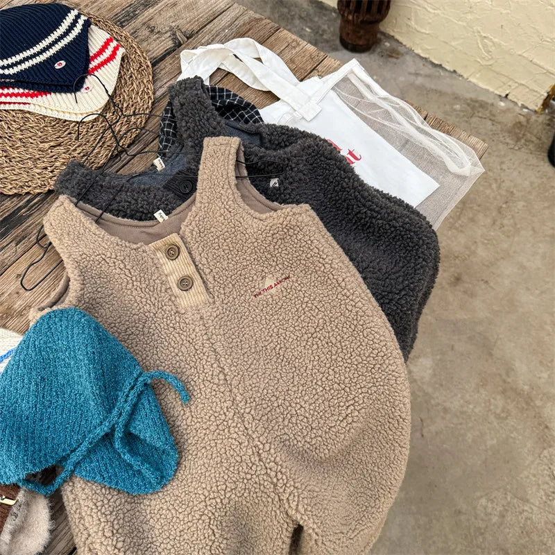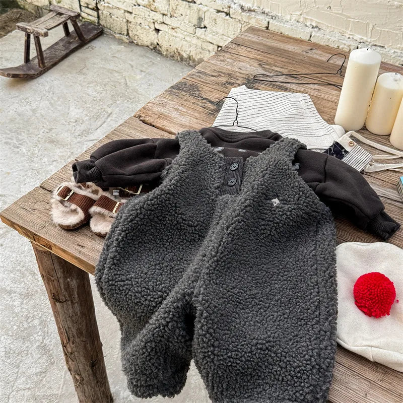 Get ready for winter adventures with our Thick Sherpa Solid Overalls! ❄️🐑 Designed for both warmth and style, these unisex overalls feature a thick, cozy sherpa lining that’s perfect for frosty days. With a comfortable elastic waistband and loose, relaxed fit, these overalls make layering easy while keeping little ones snug. The solid color and casual design make it a versatile wardrobe essential, great for outdoor play, family outings, or simply staying warm. These overalls are a winter must-have for kids aged 1-6! 🌟💙