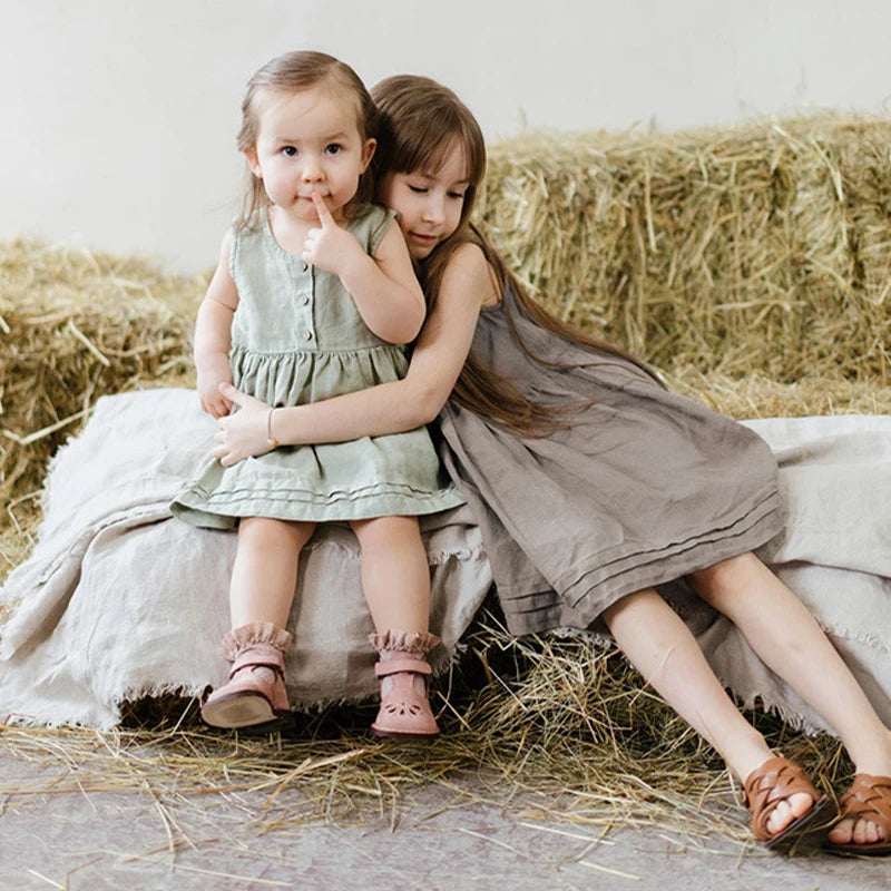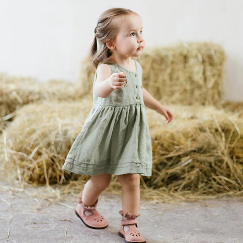 Made from a soft blend of cotton and linen, this dress is breathable and comfortable for all-day wear. The vintage-inspired pleated design adds a touch of elegance, while the A-line silhouette flatters any figure. Available in a range of sizes for girls aged 1-6 years, this dress is a must-have for any spring wardrobe.