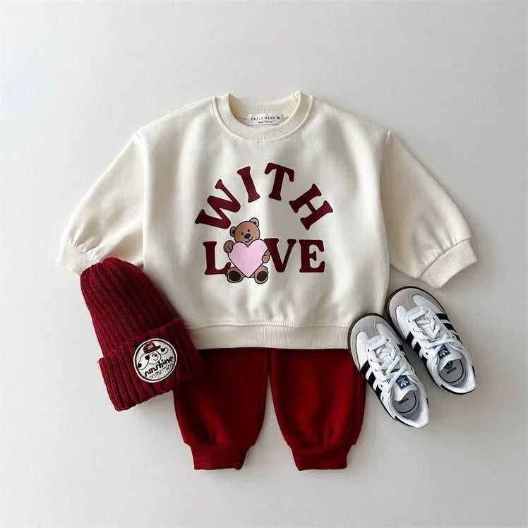 Active days meet adorable charm with our 'WITH LOVE' Cute Jogger Set! 🧡 This unisex set, made from soft, breathable cotton, is the perfect combo of comfort and sporty style for kids aged 1–6 years. Featuring a playful cartoon pattern and a pullover design, it’s easy to wear and oh-so-stylish. The O-neck and regular long sleeves provide a relaxed fit, while the standard thickness makes it versatile for year-round wear. Whether it’s playtime or a casual outing, this jogger set is sure to spread warmth and love! 🏃♀️💕